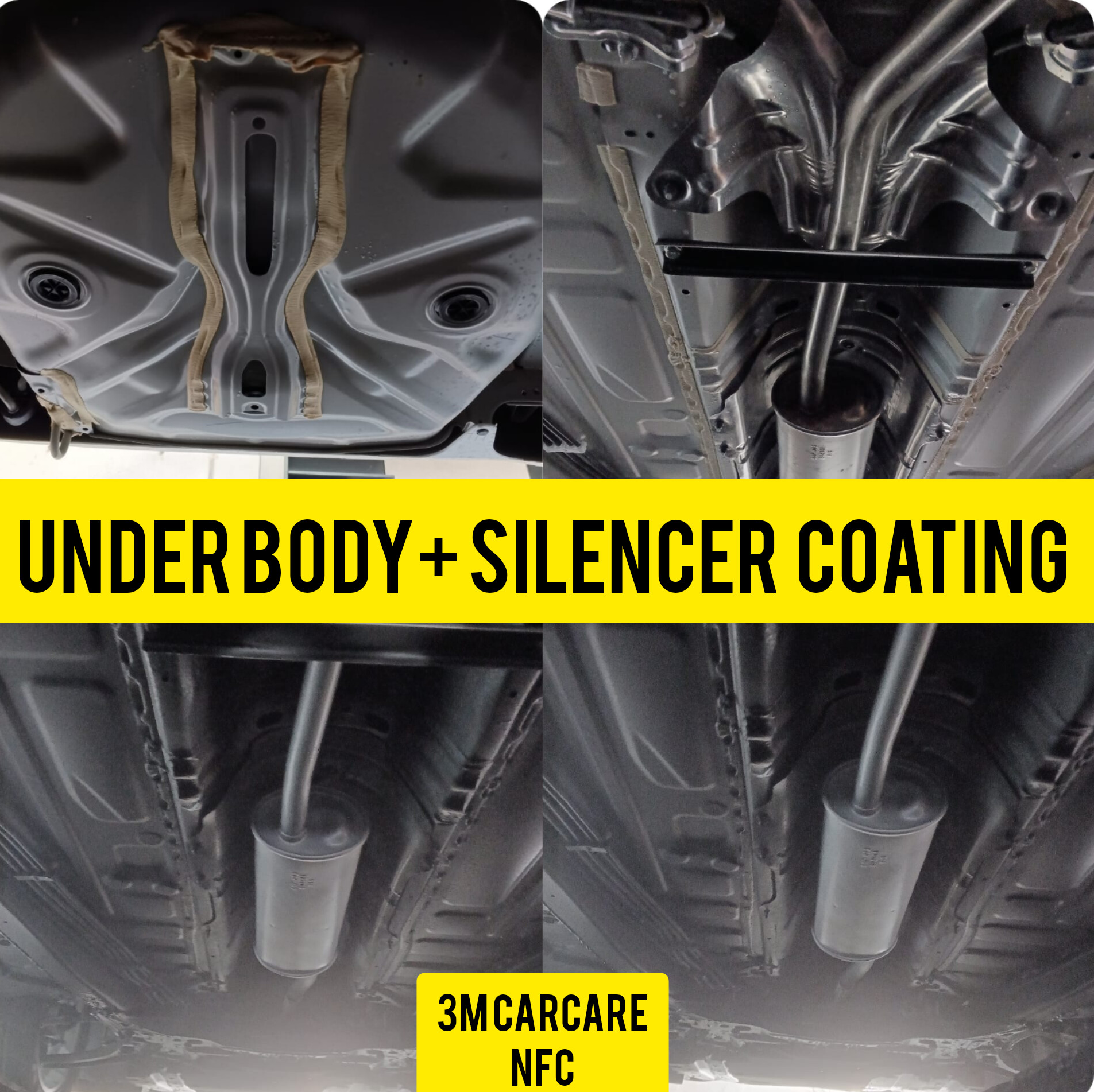 3M Car Care NFC Underbody + Silenc 1. Anti corrosion treatment for the underbody - this comes in 2 year and a 5 year version. The compounds used are different. . 3M™ Underbody Treatments offers you a long term solution for issues related to corrosion and rust. First, the car under body is washed and degreased. Then, the 3M™ Protective Coat is applied with Body Schutz Gold Gun (5 year Warranty) or Undershield gun (2 year warranty). The 3M™ Body Schutz/Undershield, is a hard coating on the underbody of the car, that is fast-drying, paintable, rubberized, non-toxic and chip-resistant. It also minimizes sound from underneath the vehicle and insulates against the heat and cold. The 3M™ Underbody Treatment protects the car underbody from rust, increasing the longevity of the car and thus enhancing its resale value. 2. Silencer Coating - an aluminium coating for the Silencer. It covers the entire length of the Silencer including the muffler.er Coating #3mcarcarenf # 3munderbody+silencercoating #brezzaunderbody+silencercoating #marutisuzukibrezza #3mcarcarenewfriendscolony